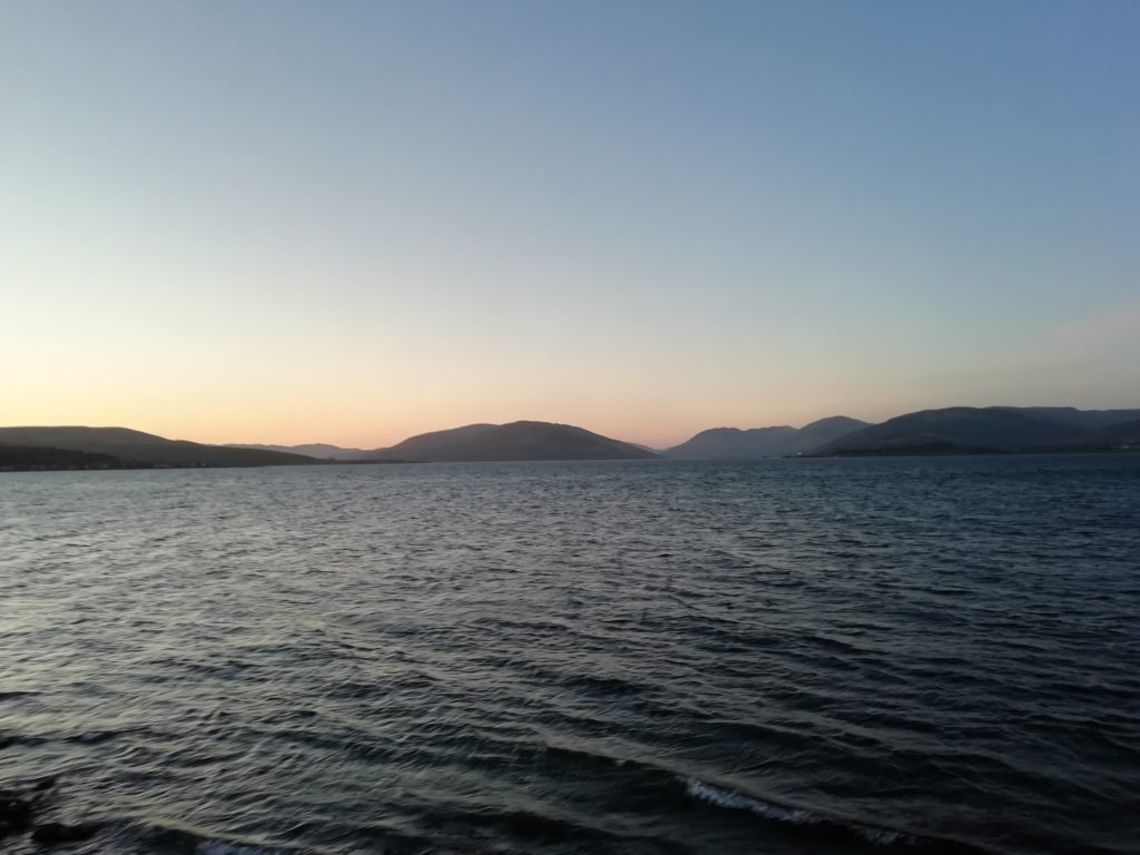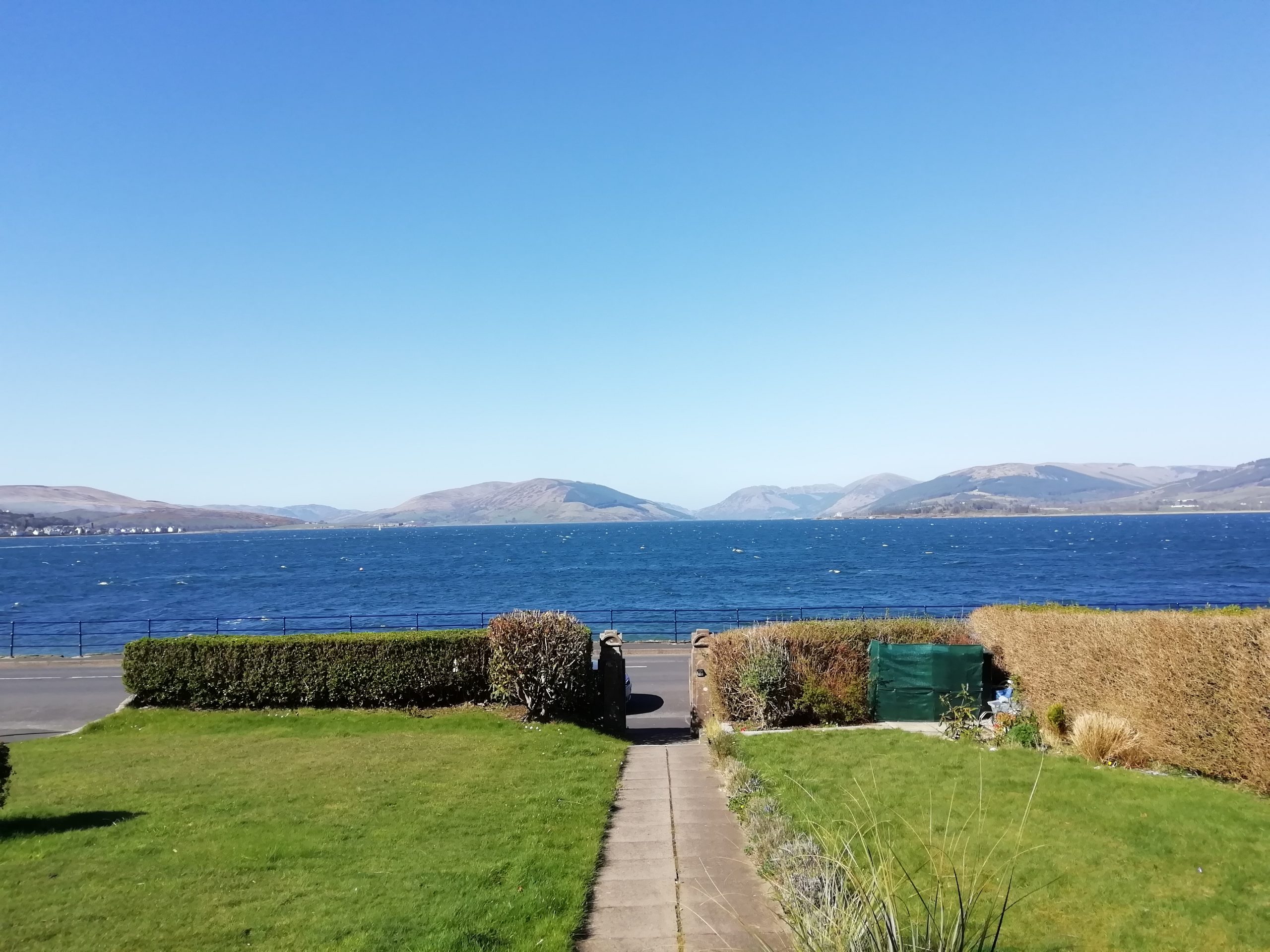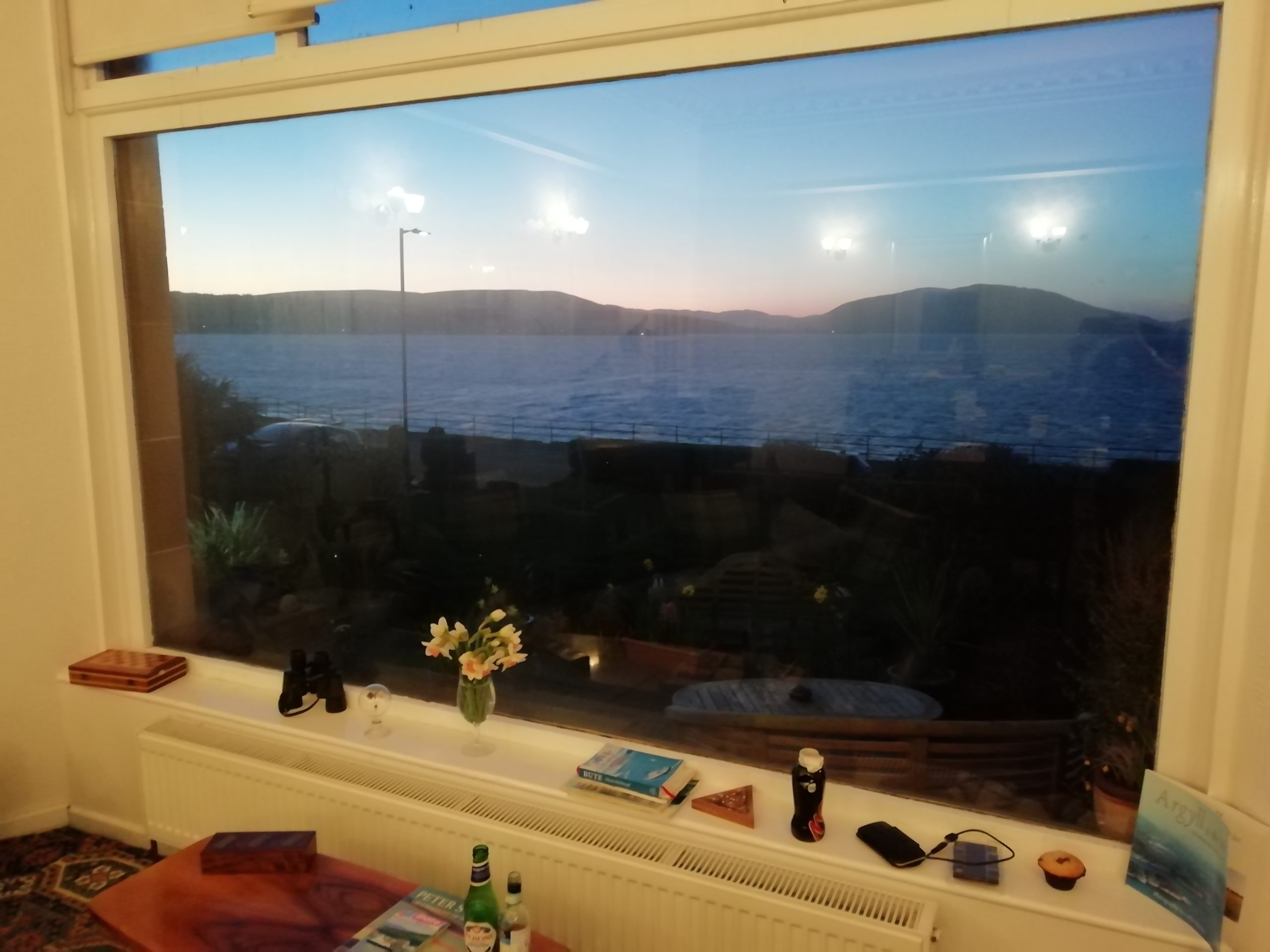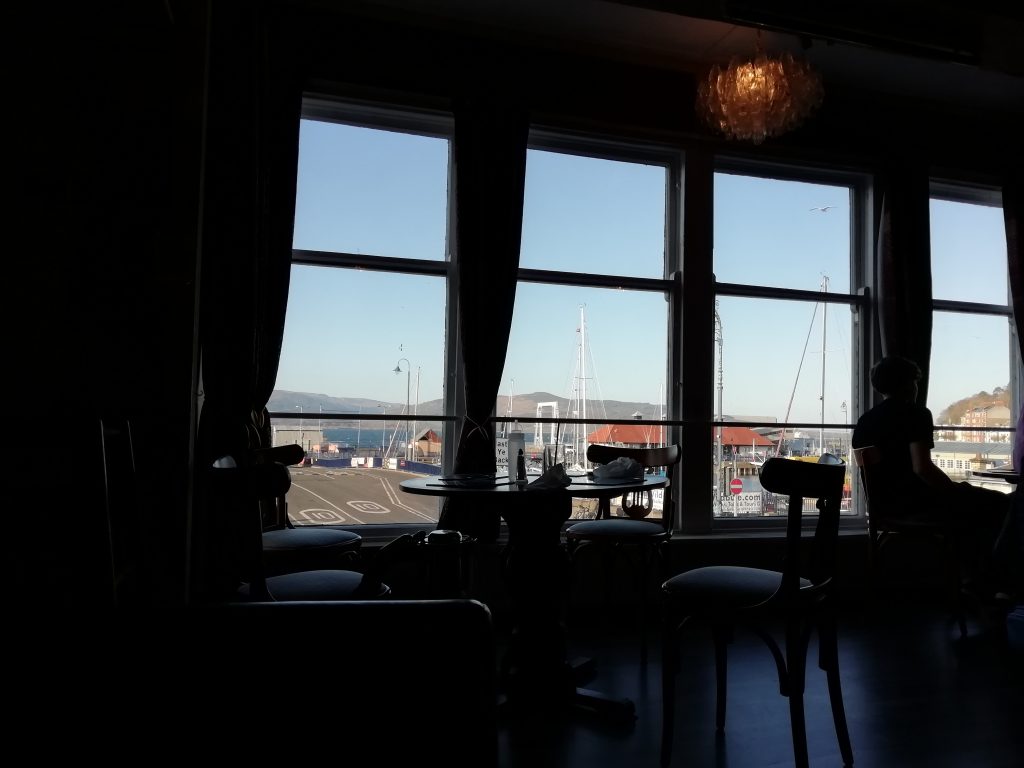 My accommodation is a lovely B&B set in quite an old building, looking North East out of Rothesay across to the Cowal peninsular. I’ve got a sea view from the first floor. The breakfast room downstairs has a lovely view too, sofas at the front looking out the window, and I can also use it if I want to bring a takeaway back. Tea, coffee, hot chocolate, soft and alcoholic drinks available on request. I may have a takeaway one night while I’m here.