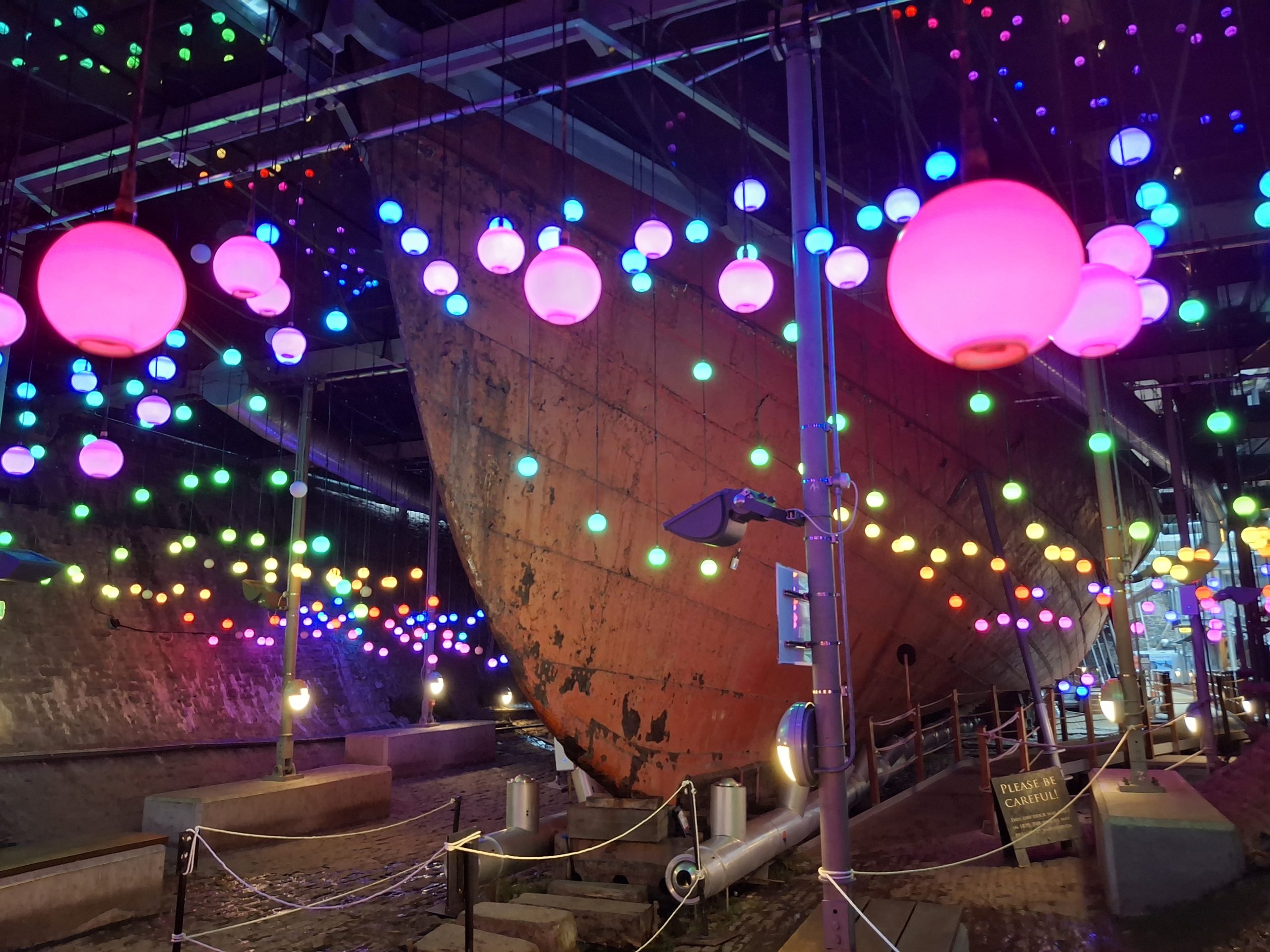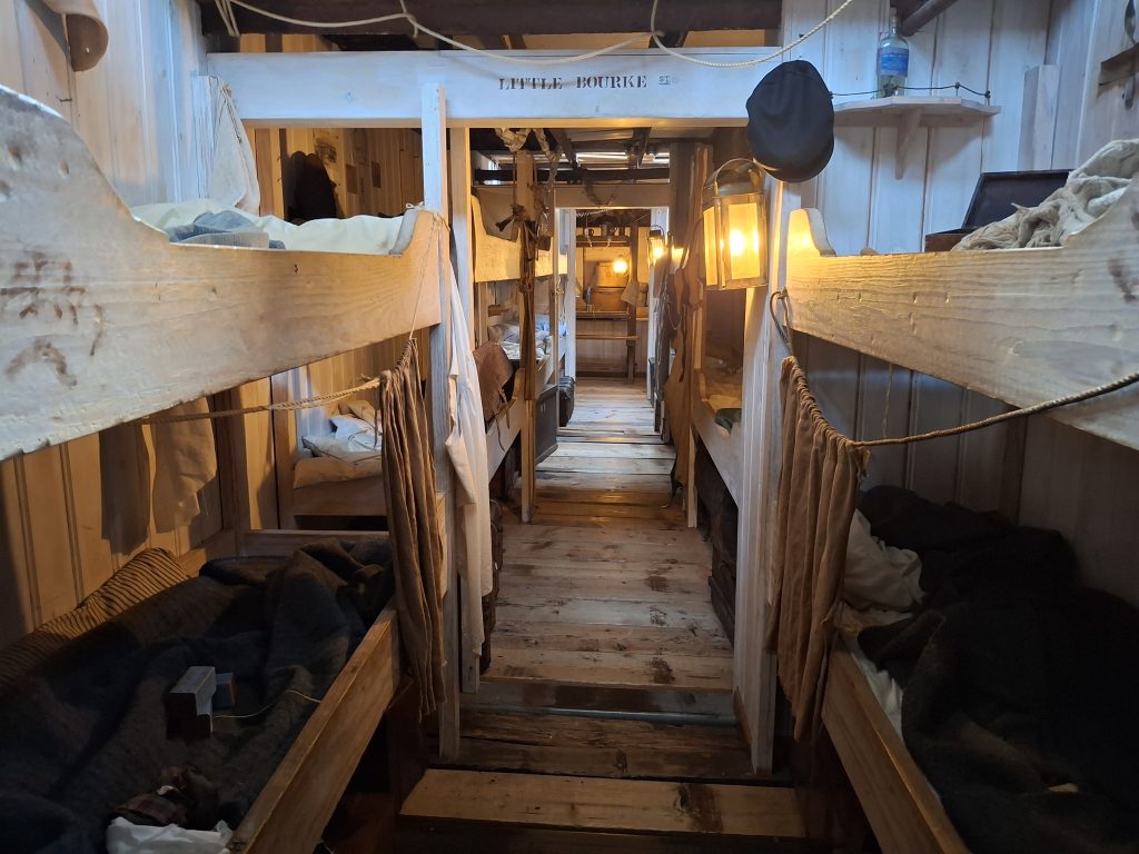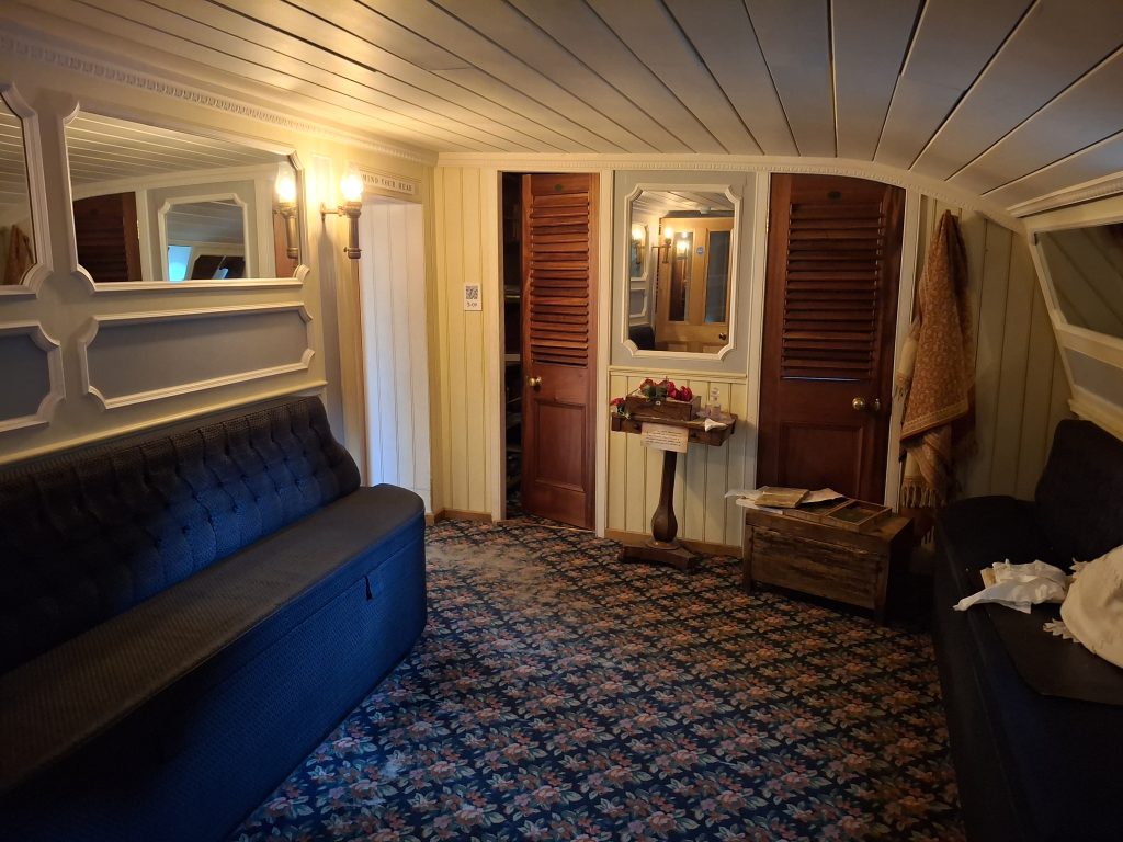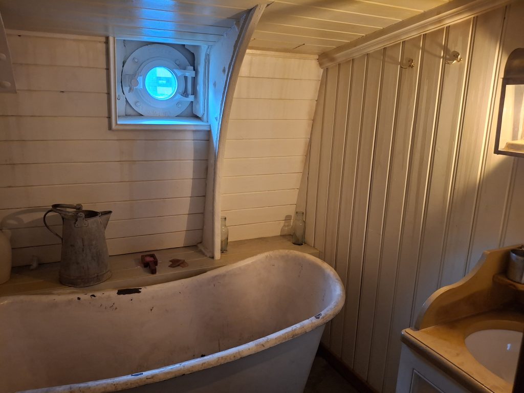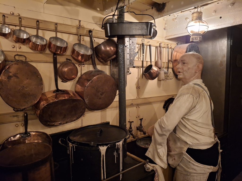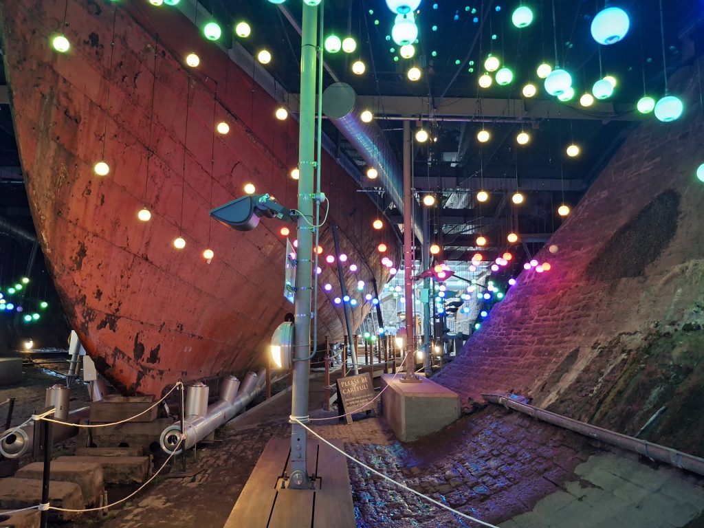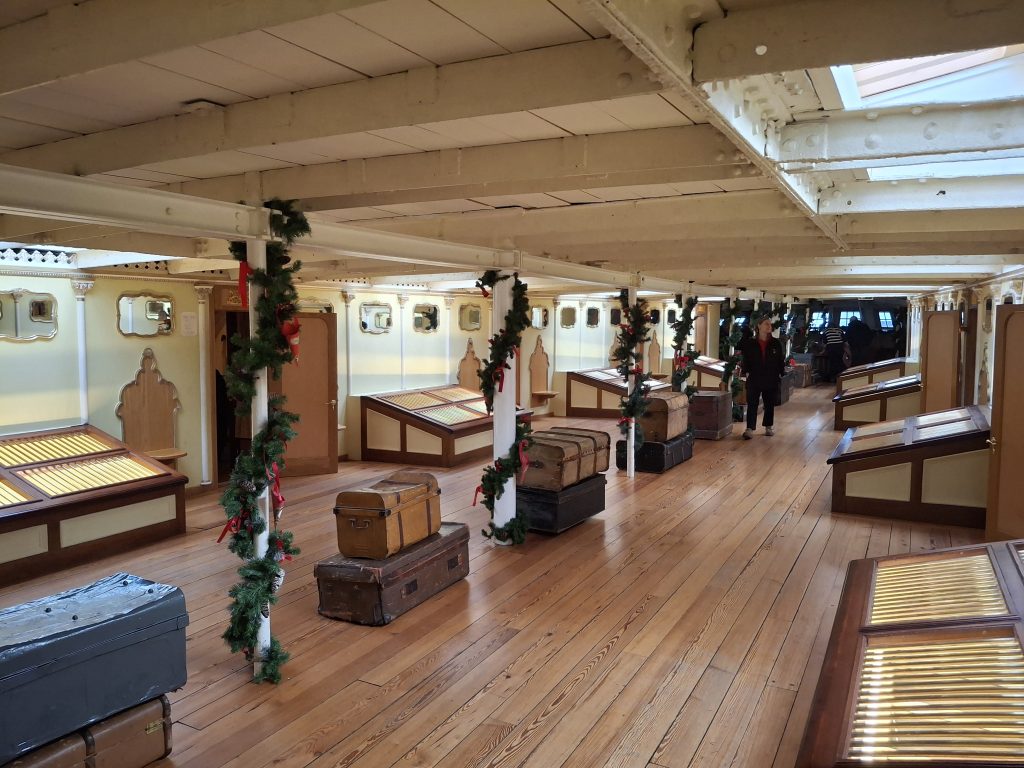 There are three decks on board the ship to explore – the outside deck, the accommodation deck (including steerage, the kitchen, engine room, first class cabins) and a lower deck with the dining room. Down below you can go and see the dry dock, and at the moment that area is also being used for the festive light display, which was impressive.