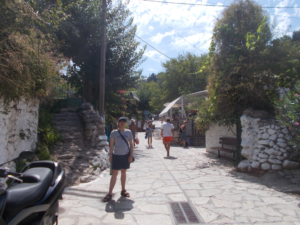 Agios Nikitas and Pefkoulia 18 August 2016 0 The centre of the village is entirely pedestrianised. The bus dropped us by the main road close to the barrier. We wandered down the main street, past all the tavernas, bars and cafés. At the bottom we found the main beach. By the time we arrived it was lunch time so we found a café to get something to eat and drink.